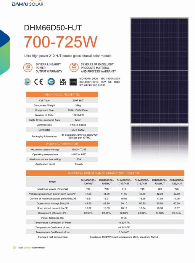 Ultra nagy teljesítményű 210 HJT dupla üveg bifaciális napelem modul